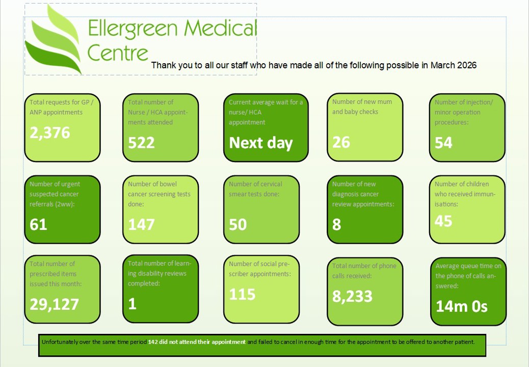 To keep our patients up-to-date with what the practice has been doing, each month we will share with you our practice bulletin. This details what the practice has achieved over the previous month such as appointment data, cancer screening, immunisations and telephone waiting times. Look at what the practice has achieved during March 2026.