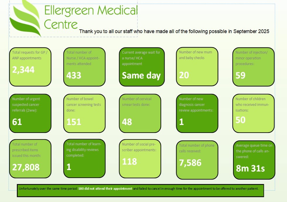 To keep our patients up-to-date with what the practice has been doing, each month we will share with you our practice bulletin. This details what the practice has achieved over the previous month such as appointment data, cancer screening, immunisations and telephone waiting times. Look at what the practice has achieved during September 2025.