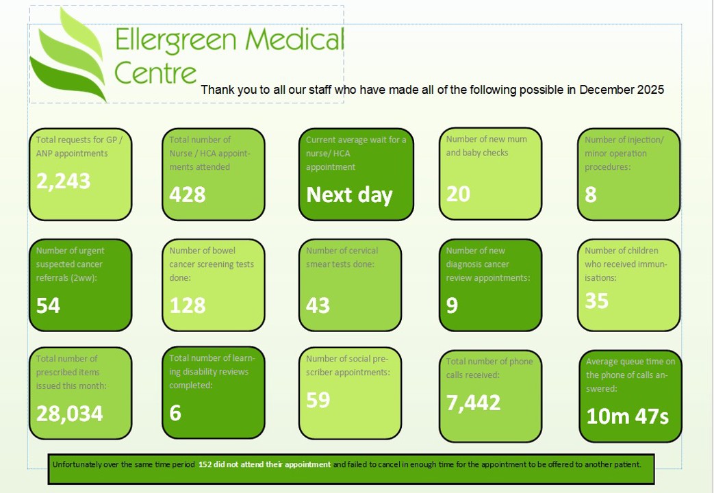 To keep our patients up-to-date with what the practice has been doing, each month we will share with you our practice bulletin. This details what the practice has achieved over the previous month such as appointment data, cancer screening, immunisations and telephone waiting times. Look at what the practice has achieved during December 2025.